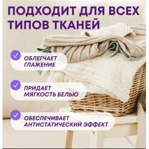Средство смягчает волокна, облегчает глажение, устраняет статическое электричество и сохраняет цвет. Подходит для всех типов тканей, включая детское бельё и деликатные материалы. Безопасен для септиков.