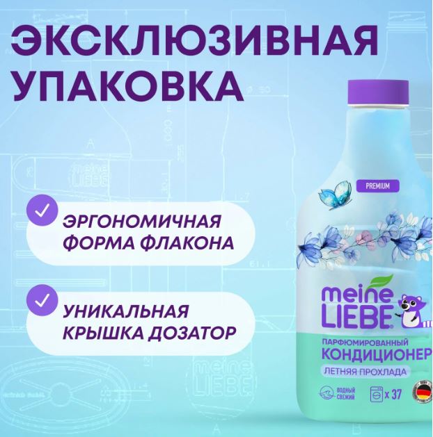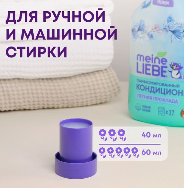 Meine Liebe «Летняя прохлада» — парфюмированный кондиционер для белья с нежным цветочным ароматом, который раскрывается нотами апельсинового цвета, морского бриза и фиалки. Обеспечивает мягкость, свежесть и антистатический эффект после каждой стирки.