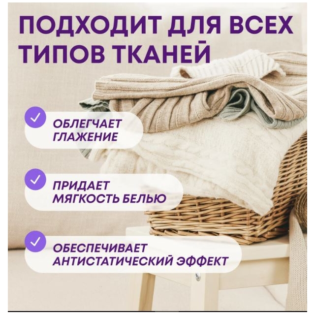 Средство смягчает волокна, облегчает глажение, помогает сохранить цвет и структуру ткани. Подходит для белых, светлых и цветных тканей. Удобная упаковка с дозатором обеспечивает экономичный расход.
