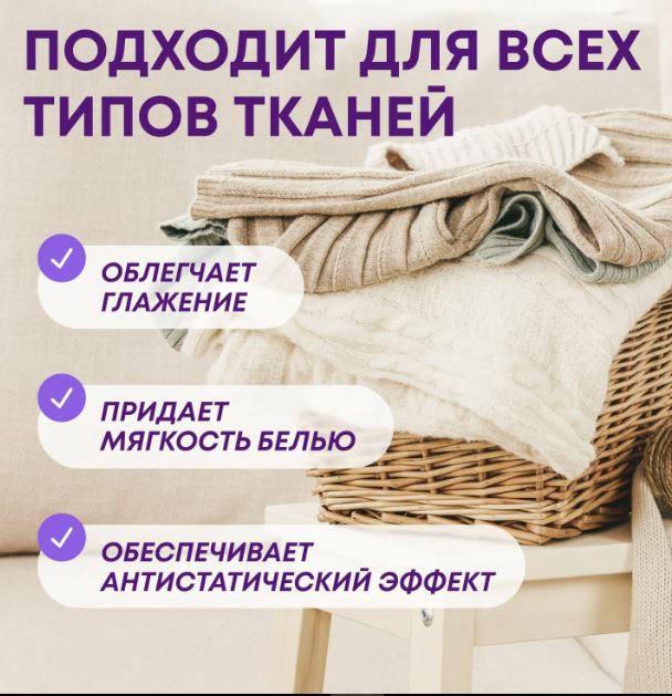 Средство смягчает и разглаживает волокна, снимает статическое электричество, облегчает глажение и помогает сохранить цвет ткани. Подходит для всех типов материалов. Экологичен и безопасен для септиков.