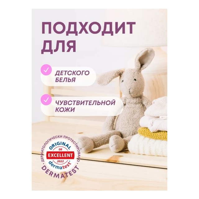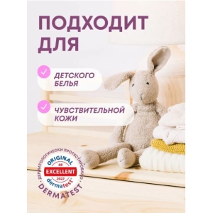 Средство полностью выполаскивается из волокон ткани, состав протестирован в лаборатории Dermatest в Германии и получил международный сертификат белопасности.