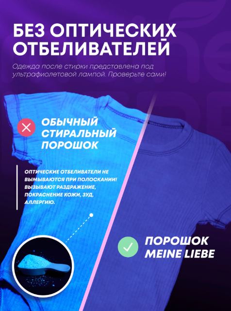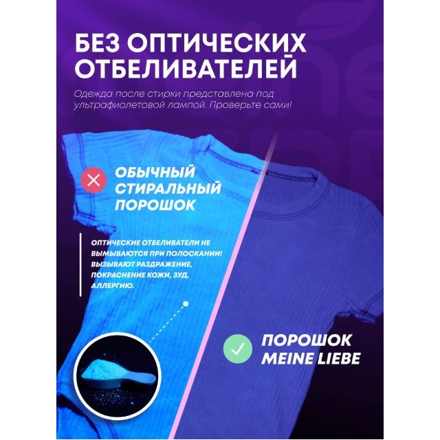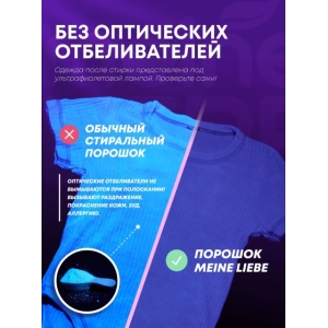 Благодаря оптимальному сочетанию энзимов, средство для стирки Meine Liebe безупречно отстирывает сложные, застарелые пятна, предотвращая деформацию и усадку ткани, а также нейтрализует неприятные запахи. Порошок можно использовать для цветного color, белого, черного белья из натуральных, синтетических и смешанных тканей, ручной и машинной стирки автомат при температуре от 30 до 90 градусов С, эффективен даже в прохладной воде и на коротких циклах стирки. Порошок-концентрат Meine Liebe полностью и без остатка выполаскивается из ткани, не оставляя следов и не вызывая раздражения, что идеально подходит для людей с чувствительной кожей (сертифицирован Derma test).