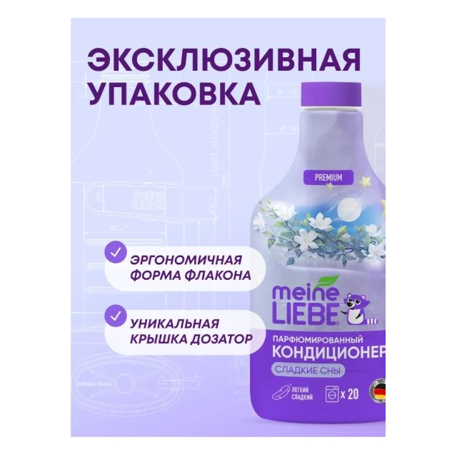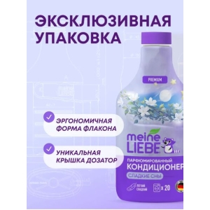 Концентрированный кондиционер для белья Meine liebe (Майне Либе) Сладкие сны - это экологичное, гипоаллергенное средство для стирки, которое бережно ухаживает за всеми типами ткани. Наш кондиционер разработан на основе натуральных веществ, которые смягчают волокна ткани, делая одежду невероятно мягкой и приятной на ощупь. Сбалансированный состав ополаскивателя для белья облегчает глажение, снимает статический заряд (одежда не бьется током), а также позволяет сохранить цвет и структуру волокон даже после многократных стирок. Вы можете быть уверены, что ваша одежда останется свежей и яркой, как в день покупки. Кроме того, кондиционер Meine Liebe эффективно устраняет неприятные запахи, оставляя вашу одежду свежей с тонким, еле уловимым, убаюкивающим ароматом. Кондиционер подходит для цветного color, белого, черного белья из хлопка, шерсти, вискозы, мембраны, ткани из синтетических и смешанных волокон ручной и машинной стирки автомат. Концентрированной формулы хватит на 27+ стирок при полной загрузке машинки на 4-5 кг сухого белья, что в два раза экономичнее обычных ополаскивателей. Бытовая химия Meine Liebe безопасна для домов с автономными канализациями (септиками). Состав и упаковка средств биоразлагаемые, не содержат хлора, фосфатов, фосфонатов не загрязняют окружающую среду и полностью соответствуют ЭКО-стандартам. Все средства Meine Liebe изготовлены по уникальной формуле под контроль качества компании Grunlab (Германия), что гарантирует их надежность и эффективность.