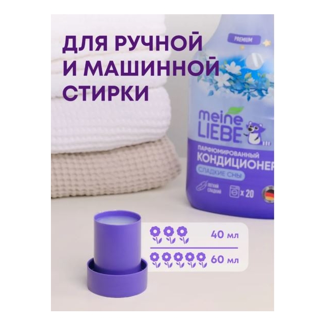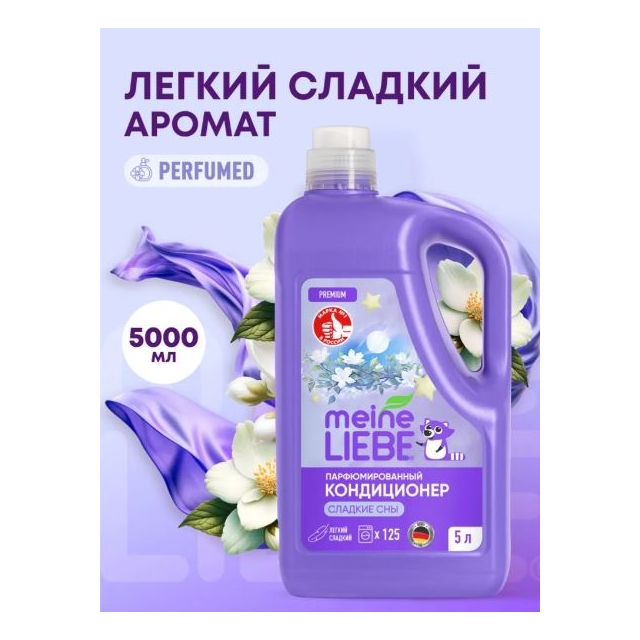 Концентрированный кондиционер для белья Meine liebe (Майне Либе) Сладкие сны - это экологичное, гипоаллергенное средство для стирки, которое бережно ухаживает за всеми типами ткани. Наш кондиционер разработан на основе натуральных веществ, которые смягчают волокна ткани, делая одежду невероятно мягкой и приятной на ощупь. Сбалансированный состав ополаскивателя для белья облегчает глажение, снимает статический заряд (одежда не бьется током), а также позволяет сохранить цвет и структуру волокон даже после многократных стирок. Вы можете быть уверены, что ваша одежда останется свежей и яркой, как в день покупки. Кроме того, кондиционер Meine Liebe эффективно устраняет неприятные запахи, оставляя вашу одежду свежей с тонким, еле уловимым, убаюкивающим ароматом. Кондиционер подходит для цветного color, белого, черного белья из хлопка, шерсти, вискозы, мембраны, ткани из синтетических и смешанных волокон ручной и машинной стирки автомат. Концентрированной формулы хватит на 27+ стирок при полной загрузке машинки на 4-5 кг сухого белья, что в два раза экономичнее обычных ополаскивателей. Бытовая химия Meine Liebe безопасна для домов с автономными канализациями (септиками). Состав и упаковка средств биоразлагаемые, не содержат хлора, фосфатов, фосфонатов не загрязняют окружающую среду и полностью соответствуют ЭКО-стандартам. Все средства Meine Liebe изготовлены по уникальной формуле под контроль качества компании Grunlab (Германия), что гарантирует их надежность и эффективность.