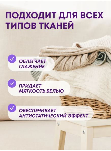 Кондиционер смягчает волокна ткани, разглаживает, снимает статический заряд, сохраняет цвет и структуру волокон.