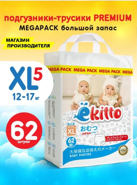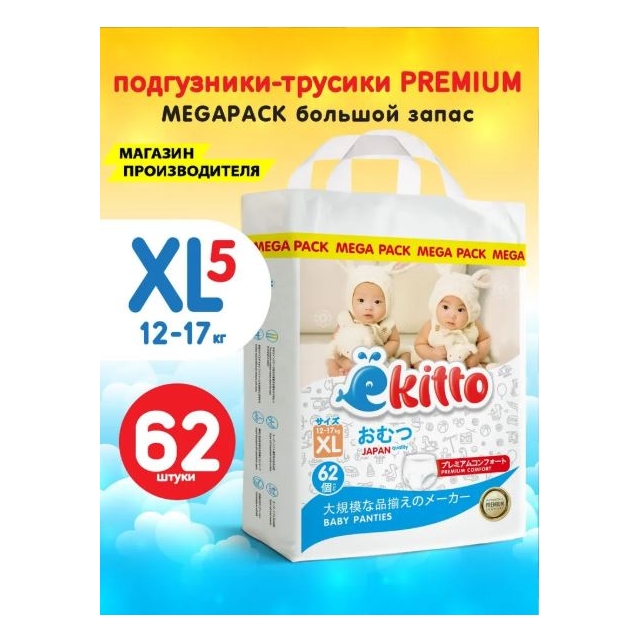 Подгузники-трусики EKITTO Premium Mega pack XL62 12+ кг