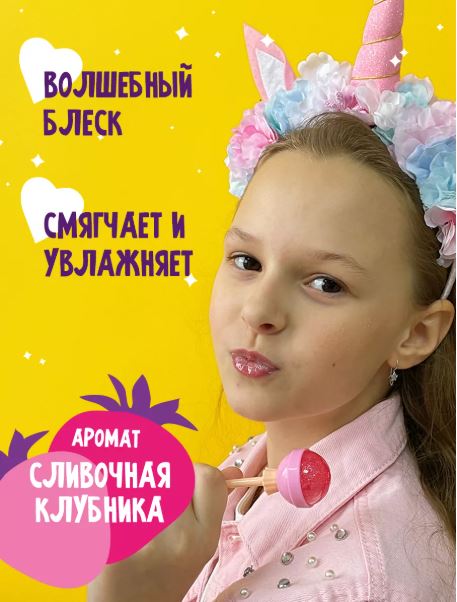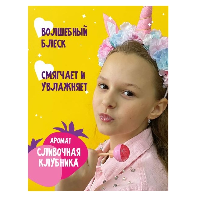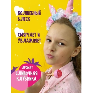Блеск для губ детский с ароматом Сливочной клубники легко наносится на губы, не оставляя ощущения липкости или жирности, только качественная по составу косметика. Он создает эффект легкого сияния, увлажняет губы и смягчает их, защищая от обветривания. Покрытие блеска для губ прозрачное с нежным оттенком и яркими блестками, которые сверкают как звездочки на губках маленькой принцессы. Этот детский блеск прошёл испытания сертификации на использование для детей от 3-х лет, что особенно важно для безопасности здоровья вашего ребёнка и правильного ухода для губ. Дизайн такого бальзама для губ с оттенком по-настоящему удивляет, ведь это настоящий chupa chups на палочке со вкусом клубнички и легким шиммером.
