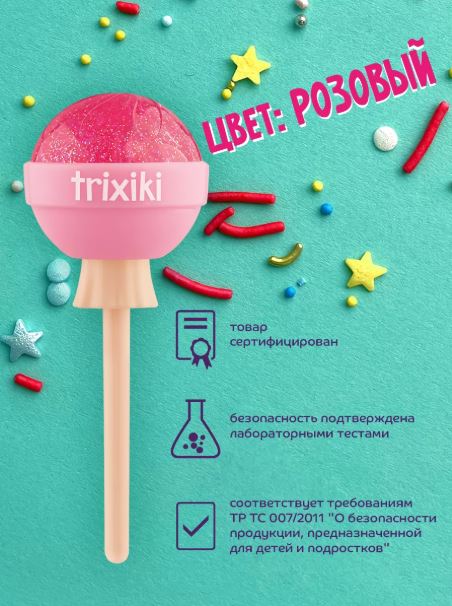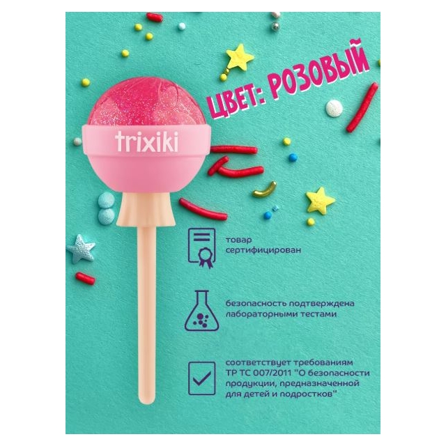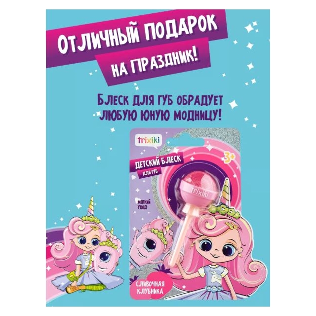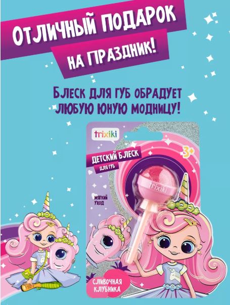 Такой бальзам для губ станет отличным дополнением к любому детскому набору косметики, идеально подойдёт для подарочного бокса товаров для макияжа на день рождение дочери, сестры, подруги, подростка, или в качестве подарка на 8 марта, Новый год или любой другой праздник. Подобный подарок для девочки вы можете собрать из других товаров нашего бренда TRIXIKI, добавив, например, Детский лак для ногтей и другие милые штучки в подарок. Такая натуральная и милая косметика это оригинальный подарок для девочки, который порадует вашу юную модницу и станет её любимым аксессуаром для губ. Ведь прозрачные блески с блестками остаются всё такими же популярными косметическими средствам наравне с тинтами, маслами для губ и корейскими помадами.Состав