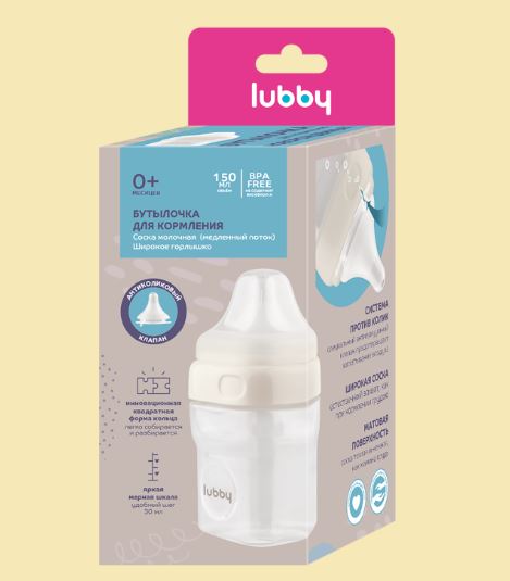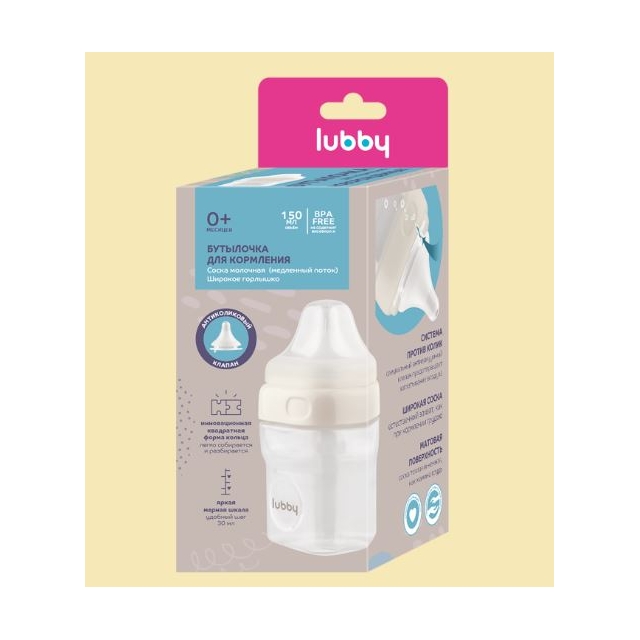 Мерная шкала имеет удобный шаг в 30 мл. К бутылочке подходят все молочные соски lubby для бутылочек с широким горлышком.- объем 150 мл.